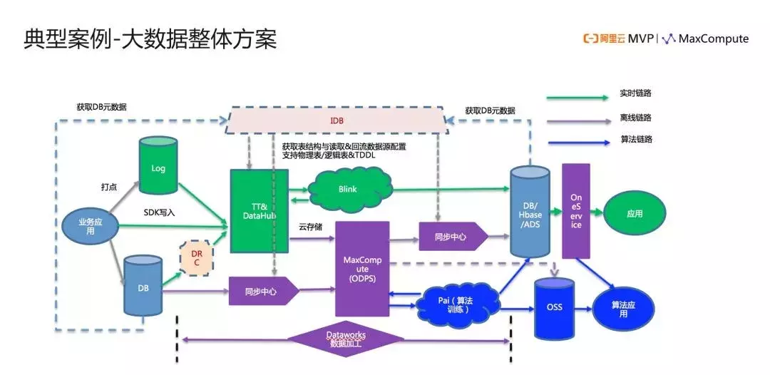 这张图实际上是优酷,包括可能现在阿里集团内部一些非常典型的技术架构图。中间可以看到,MaxCompute在中间核心的位置,左侧主要是一个输入,右侧是一个输出的趋向,绿色的线是一个实时的链路,包括现在我们从整个的数据源上,比如DB也好或者服务器的本地日志Log也好,我们通过TT&Datahub存储到MaxCompute上面做分析。当然现在非常火的Flink实时计算,其实是作为一个实时处理的链路。