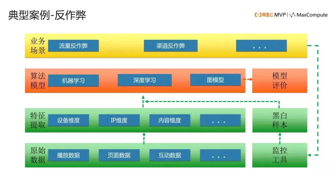 这张图是大部分互联网公司不太会涉及到的,就是关于反作弊的问题。这个是我们在MaxCompute做的一个反作弊的架构,通过原始的数据去提取它的特征,然后再通过算法模型,包括机器学习、深度学习、图模型去支持流量反作弊、渠道反作弊等等。再通过业务场景上反作弊的监控工具,把监控到的作弊信息去打一个黑白样本,再把这个黑白样本跟特征一起来不断地迭代优化算法模型。同时针对算法模型,做一个模型的评价,不断来完善反作弊体系。