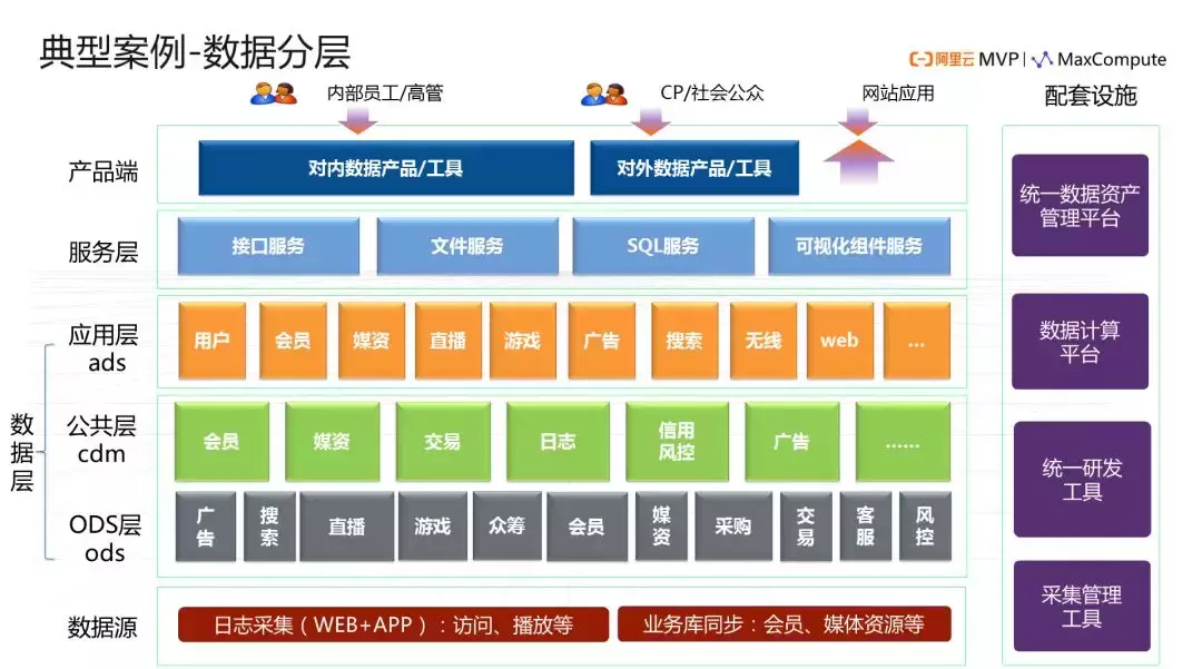 这张图可能也是业界比较流行的一个数仓分层的图,因为我们这边是数据中台,所有的数据都是统一从ods层cdm层,然后ads层,去一层一层地往上去做精细,再到最上面,通过接口服务、文件服务、SQL服务,去提供多样化的服务。再往上面,提供对内的一些数据产品,对高管、对小二,可能还有一些对外的,比如说像优酷的播放数,包括热度这些对应用的数据。