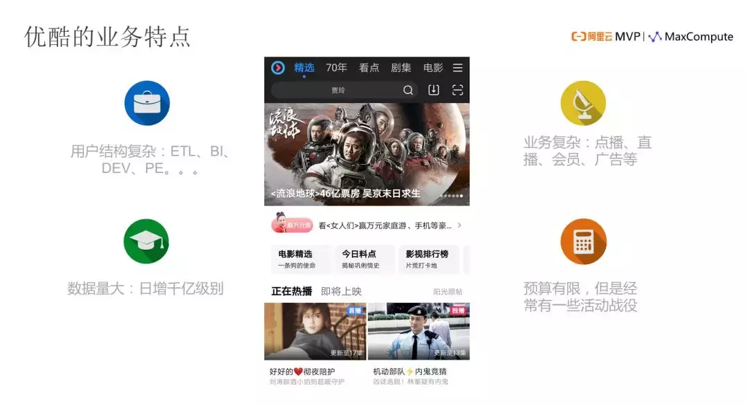 第一个特点,简单易用。MaxCompute有一个非常完整的链路,不管是从数据开发,还是数据运维,包括数据集成,数据质量的管控,还有整个数据地图,数据安全。当年优酷从Hadoop迁到MaxCompute之后,我们最大的体会是不用经常自己半夜起来去维护集群了,不用去跑任务了,之前别人提一个需求过来,我可能要排几周,现在我可以告诉他,我给你马上跑一下,就可以出来了。包括之前像分析师BI还要登录客户端,写脚本,自己写调度,经常会说我的数据今天为什么没出来?包括高层看的数据,可能要到12点钟才能出来。而现在基本上所有重要的数据都会在7点钟产出,包括一些基本的业务需求,其实分析师或者产品,他们自己都可以实现了,不需要所有需求都提到数据这边。