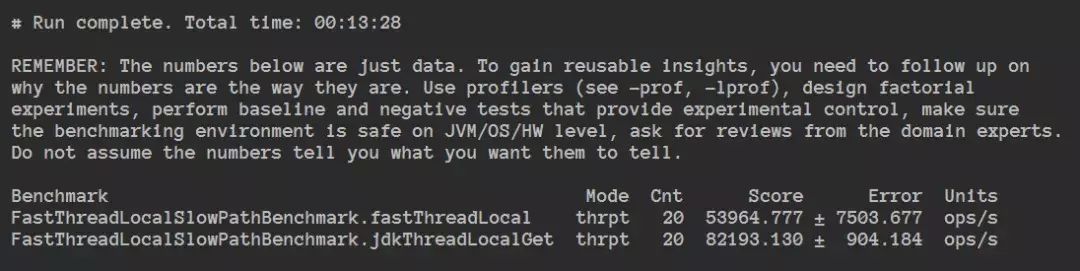 FastThreadLocalSlowPathBenchmark测试结果:比ThreadLocal的吞吐量还低。