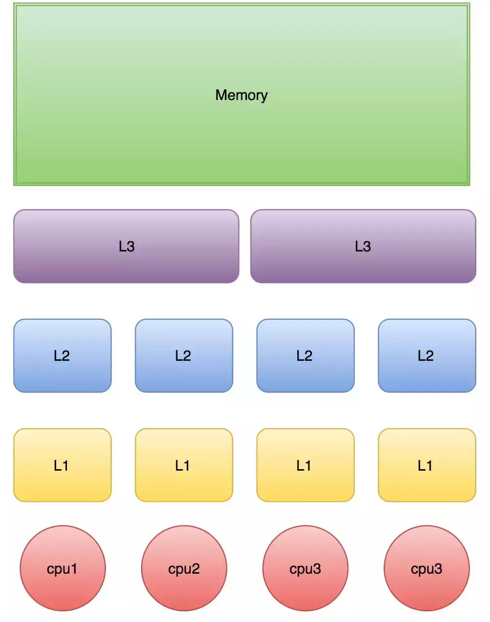 下图是计算的基本结构。L1、L2、L3分别表示一级缓存、二级缓存、三级缓存,越靠近CPU的缓存,速度越快,容量也越小。所以L1缓存很小但很快,并且紧靠着在使用它的CPU内核;L2大一些,也慢一些,并且仍然只能被一个单独的CPU核使用;L3更大、更慢,并且被单个插槽上的所有CPU核共享;最后是主存,由全部插槽上的所有CPU核共享。