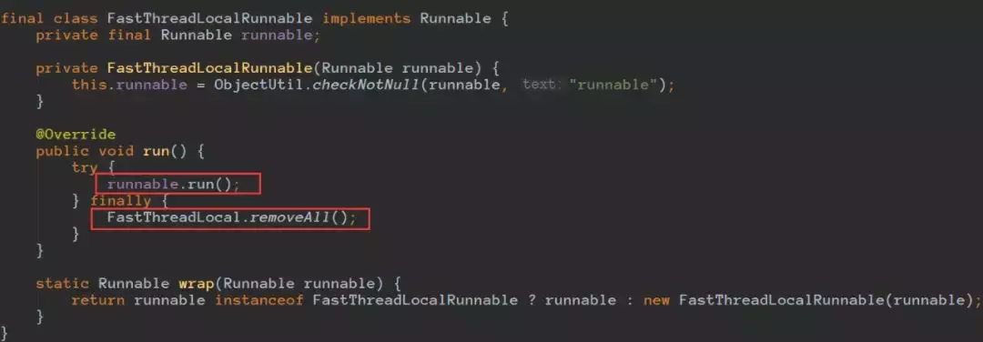 由于构造FastThreadLocalThread的时候,通过FastThreadLocalRunnable对Runnable对象进行了包装: