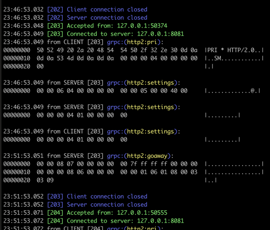 其中我们可以看到 gRPC 的一个请求的初始化和来回,可以看到第一个请求其中的 stream id 为 1。