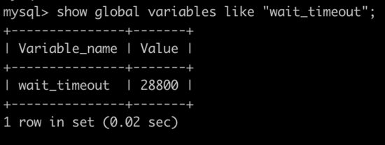 这里的 ConnMaxLifetime 一定要设置的小于 wait_timeout,可以通过如下方式查看 wait_timeout 值: