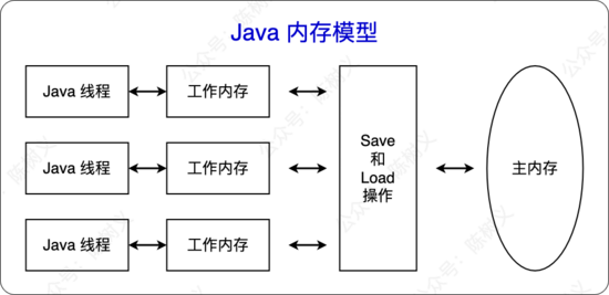 不同线程之间也无法直接访问对方工作内存中的变量,线程间变量值的传递都需要通过主内存来完成。主内存、工作内存、线程三者之间的关系如下图所示。