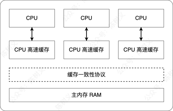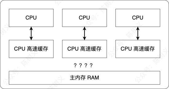 到这里,就产生了第一个问题:硬件层面上,由于多 CPU 的存在,以及加入 CPU 高速缓存,导致的数据一致性问题。