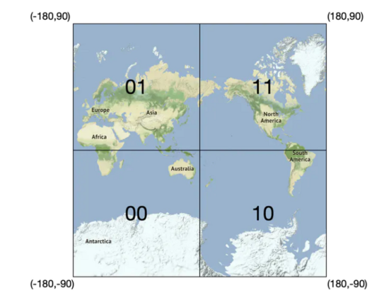 我们上面说了,二维的经度和纬度做索引的效果并不明显。而 Geohash 可以把二维的经度和纬度转换为一维的字符串,通过算法,每增加一位就递归地把世界划分为越来越小的网格,让我们来看看它是如何实现的。