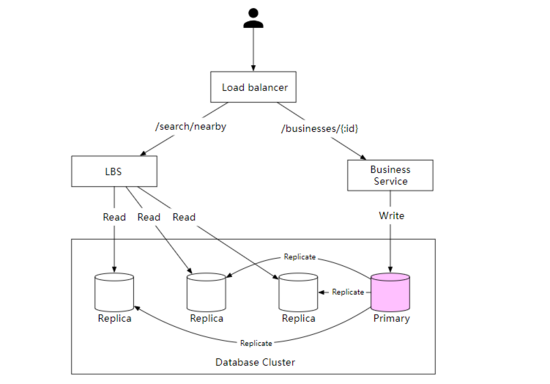 高层次设计图如下所示,系统包括两部分:基于位置的服务 (location-based service)LBS 和业务(bussiness)相关的服务。