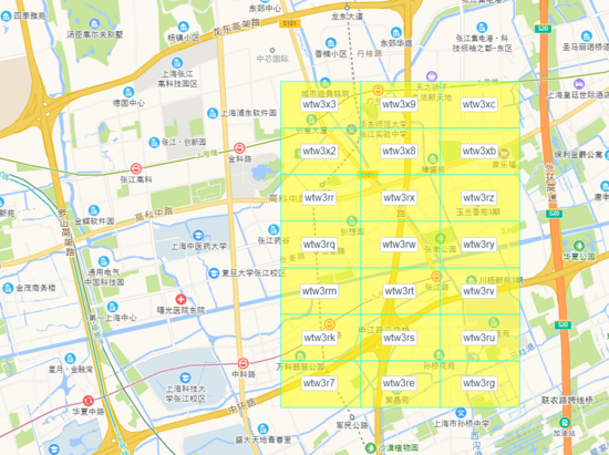 下面是一个精度比较高的网格,有些相邻网格的 Geohash 的值是完全不一样的。
