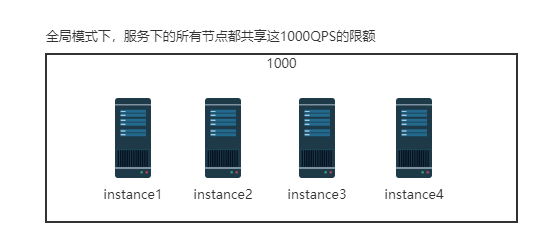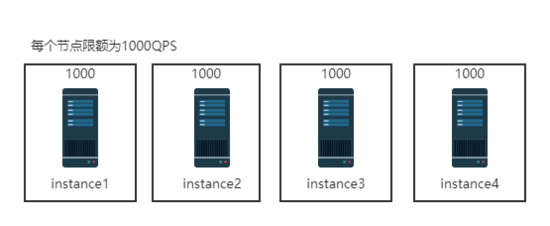 单机限流是针对单个被调实例的级别的限流,流量限额只针对当前被调实例生效,不共享,如下图所示。单机限流一般适用于保护服务自身不被打垮,按照每个服务集群单机的容量来计算配额。