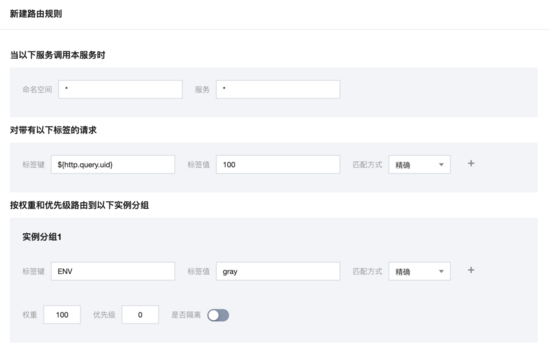 上图表达的含义是:HTTP Query Param 的 uid 参数值为 100 时,调用到 ENV=gray 的实例分组。通过路由规则能够描述出绝大多数复杂的业务场景。
