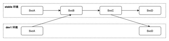 上图是非常经典的用于解决测试环境冲突的方案。一次迭代中 SvcA 需要和 SvcD 联调,当团队人数少的时候,可以直接把 stable 环境部署成开发分支代码然后进行联调。但是当多个开发任务并行的情况下就会出现环境争抢的情况。一种解决方式是每个开发任务独立部署一套全链路的环境,这种方式耗时耗力效果还很差。业界最主流的做法就是上图所示,每个开发任务子环境只需要部署联调的应用即可,链路上不在子环境里的服务都路由回 stable 稳定环境。