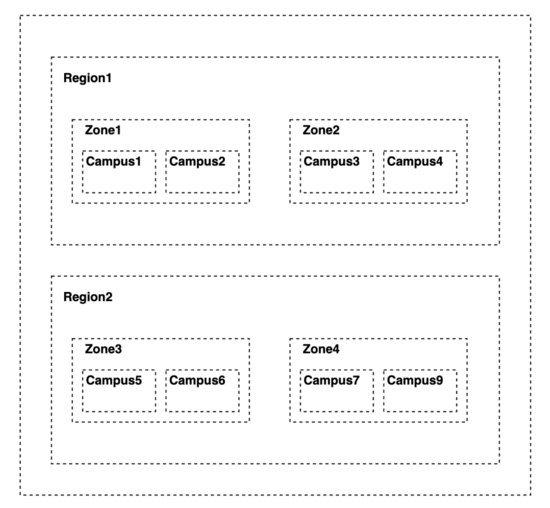 如上图所示,范围从小到大依次为: Campus < Zone < Region < All其中 Campus、Zone、Region 在服务注册发现领域模型里统一定义为元数据,是一种特殊的位置元数据(Location Metadata)。