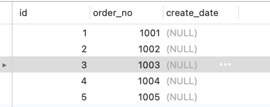 CREATE TABLE `t_order` ( `id` int NOT NULL AUTO_INCREMENT, `order_no` int DEFAULT NULL, `create_date` datetime DEFAULT NULL, PRIMARY KEY (`id`), KEY `index_order` (`order_no`) USING BTREE ) ENGINE=InnoDB ;