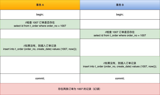 如果没有使用 select ... for update 语句,而使用了单纯的 select 语句,如果是两个订单号一样的请求同时进来,就会出现两个重复的订单,有可能出现幻读,如下图: