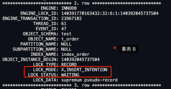 # 事务 B 插入一条记录 mysql> begin; Query OK, 0 rows affected (0.01 sec) mysql> insert into t_order(order_no, create_date) values(1010,now()); ### 阻塞状态。。。。