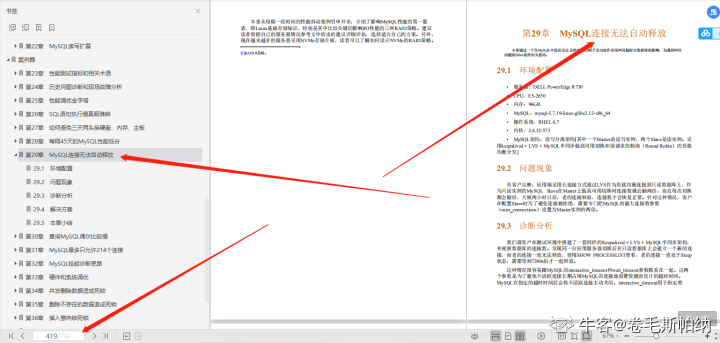 第29章MySQL连接无法自动释放:本章通过一个在MySQL中连接无法及时释放的例子引出操作系统网络超时对数据库的影响,为遇到网络问题的DBA提供相关思路。
