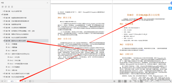 第30章查询MySQL偶尔比较慢:本章通过同一个客户网络和服务器性能优化的案例,展示了相对较复杂的情况下多因素导致数据库性能下降的场景和性能优化的方法,读者可以举一反三,对自己的环境进行优化和验证。