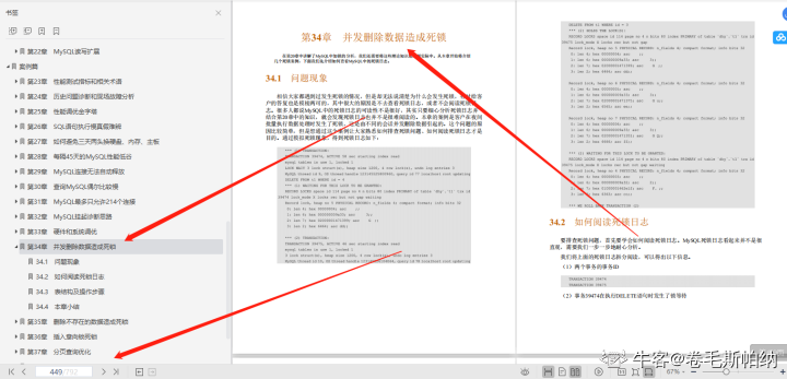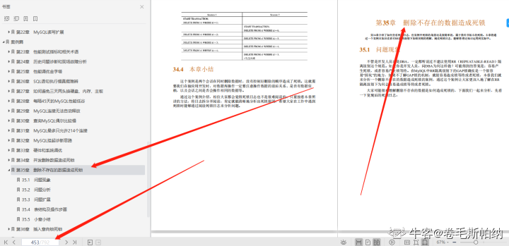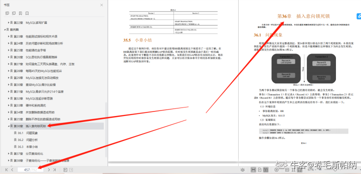 第35章删除不存在的数据造成死锁:本章将通过一个案例来加深读者对RR隔离级别下加锁规则的理解,阅读死锁日志,能够将理论知识运用到实际中。