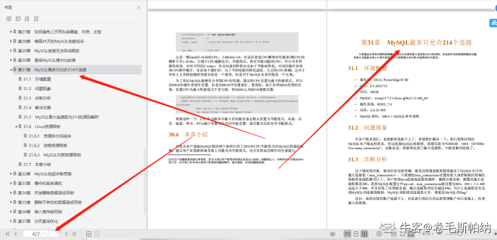 第31章MySQL 最多只允许214个连接:本章通过从原理和源码级别解析MySQL经典的最大连接数为214的案例,引出操作系统资源限制的话题,并结合当前最火的云计算和容器技术介绍资源分布和组合趋势的相关思考