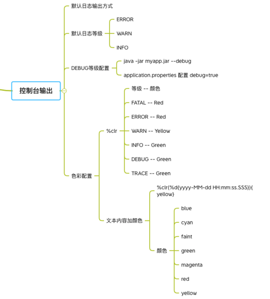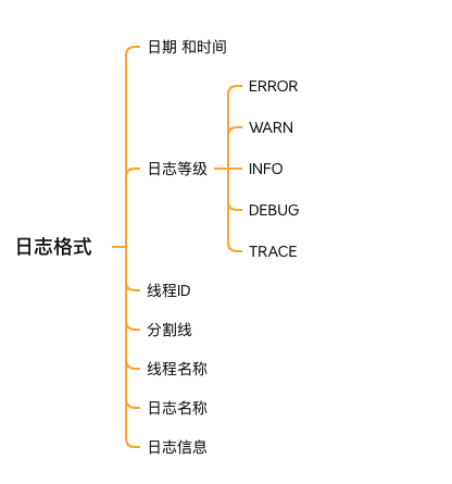 一开始是日期和时间,然后是日志的等级、线程ID、分割线、线程名称、logger name 、日志消息。我在思维导图里做了归纳, 日志等级这里我使用的是logback的等级制度,部分其他的会是以FATAL 代替 ERROR 的。