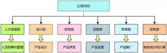 有一种很好的方式是分解公司的日常工作,将人员招聘与管理工作交给人力资源部,将产 品设计工作交给设计部,将产品开发工作交给研发部,将产品运营和产品推广工作分别交给运 营部和市场部,将公司的税务统计和计算工作交给财务部。