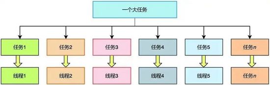 关于分工,比较官方的解释是:一个比较大的任务被拆分成多个大小合适的任务,这些大小合适的任务被交给合适的线程去执行。