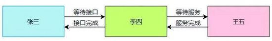 在现实生活中,这种任务的同步,更多的是靠人与人之间的交流和沟通来实现的。例如,王五的服务开发任务完成了,告诉李四,李四马上开始执行开发接口任务。等李四的接口开发完成后,再告诉张三,张三马上调用李四开发的接口将返回的数据渲染到页面上。现实生活中 的同步模型如图4所示。