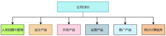这里,可以将管理好公司看作一个很大的任务,这个很大的任务可以包括人员招聘与管理、 产品设计、产品开发、产品运营、产品推广、税务统计和计算等。如果将这些工作任务都交给 CEO一个人去做,那么估计 CEO 会被累趴下的。CEO一人做完公司所有日常工作如图1所示。