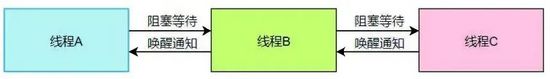 线程 A 需要阻塞等待线程 B 执行完任务才能开始执行任务,线程 B 需要阻塞等待线程 C 执行完任务才能开始执行任务。线程 C 执行完任务会唤醒线程 B 继续执行任务,线程 B 执行完任务会唤醒线程 A 继续执行任务。