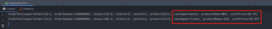 首先,调用 mapper 的 selectJoinList() 方法,进行关联查询,返回多条结果。后面的第一个参数 OrderDto.class 代表接收返回查询结果的类,作用和我们之前在 xml 中写的 resultType 类似。