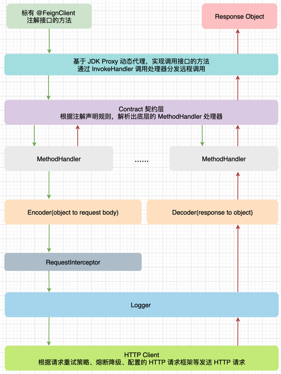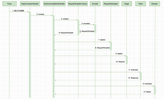 总体流程就是在方法 T newInstance(Target target) 生成一个含有 FeignInvocationHandler 的代理对象,FeignInvocationHandler 对象会持有 Map<Method, MethodHandler> map,代理对象调用的时候进入 FeignInvocationHandler#invoke 方法,根据调用的方法来获取对应 MethodHandler,然后再 MethodHandler 完成对方法的处理(处理 HTTP 请求等)。