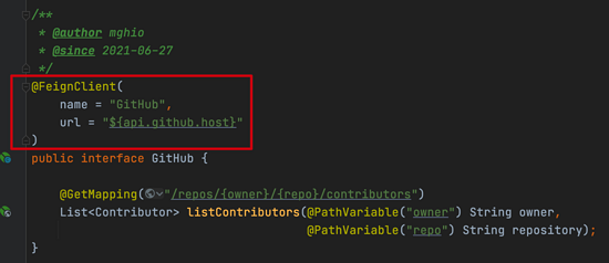 第二步:声明 HTTP 请求接口 使用 Java 的接口和 Feign 的原生注解 @RequestLine 声明 HTTP 请求接口,从这里就可以看到 Feign 给使用者封装了 HTTP 的调用细节,极大的减少了 HTTP 调用的复杂性,只要定义接口即可。