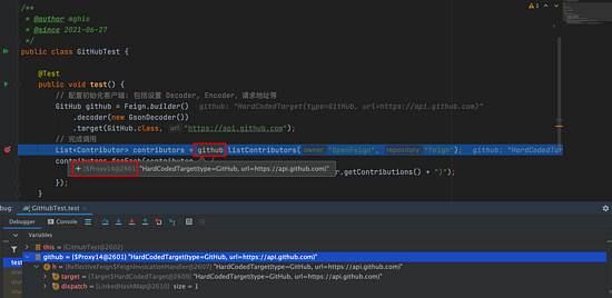 从上面第一个原生使用的例子可以看到,只是定了接口并没有具体的实现类,但是却可以在测试类中直接调用接口的方法来完成接口的调用,我们知道在 Java 里面接口是无法直接进行使用的,因此可以大胆猜测是 Feign 在背后默默生成了接口的代理实现类,也可以验证一下,只需在刚刚的测试类 debug 一下看看接口实际使用的是什么实现类: