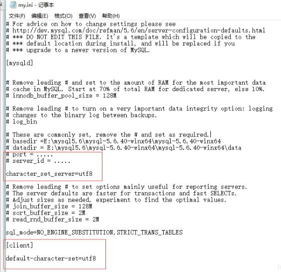 找到mysql 的配置文件(mysql5.6为my-default.ini,mysql6.0以后的是my.ini),做如下修改,主要就是添加画红框的地方,完整的配置如下: