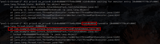 "Thread-1" #12 prio=5 os_prio=0 tid=0x00007fdff871c800 nid=0x3cc2 waiting for monitor entry [0x00007fdfce0fc000] java.lang.Thread.State: BLOCKED (on object monitor) at com.example.demo.jstack.Jstack.lambda$main$1(Jstack.java:36) - waiting to lock <0x000000076e925a90> (a java.lang.Object) - locked <0x000000076e925aa0> (a java.lang.Object) at com.example.demo.jstack.Jstack$$Lambda$2/2052001577.run(Unknown Source) at java.lang.Thread.run(Thread.java:748) "Thread-0" #11 prio=5 os_prio=0 tid=0x00007fdff871a800 nid=0x3cc1 waiting for monitor entry [0x00007fdfce1fc000] java.lang.Thread.State: BLOCKED (on object monitor) at com.example.demo.jstack.Jstack.lambda$main$0(Jstack.java:25) - waiting to lock <0x000000076e925aa0> (a java.lang.Object) - locked <0x000000076e925a90> (a java.lang.Object) at com.example.demo.jstack.Jstack$$Lambda$1/1174361318.run(Unknown Source) at java.lang.Thread.run(Thread.java:748)