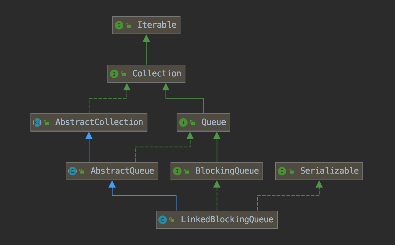 从图中得知,LBQ 实现了 BlockingQueue 接口,BlockingQueue 实现了 Queue 接口