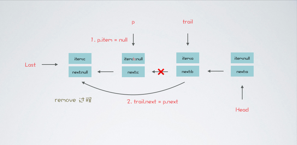 p.item = null; // 以第一次遍历而言,trail 是头节点,p 为头节点的后继节点