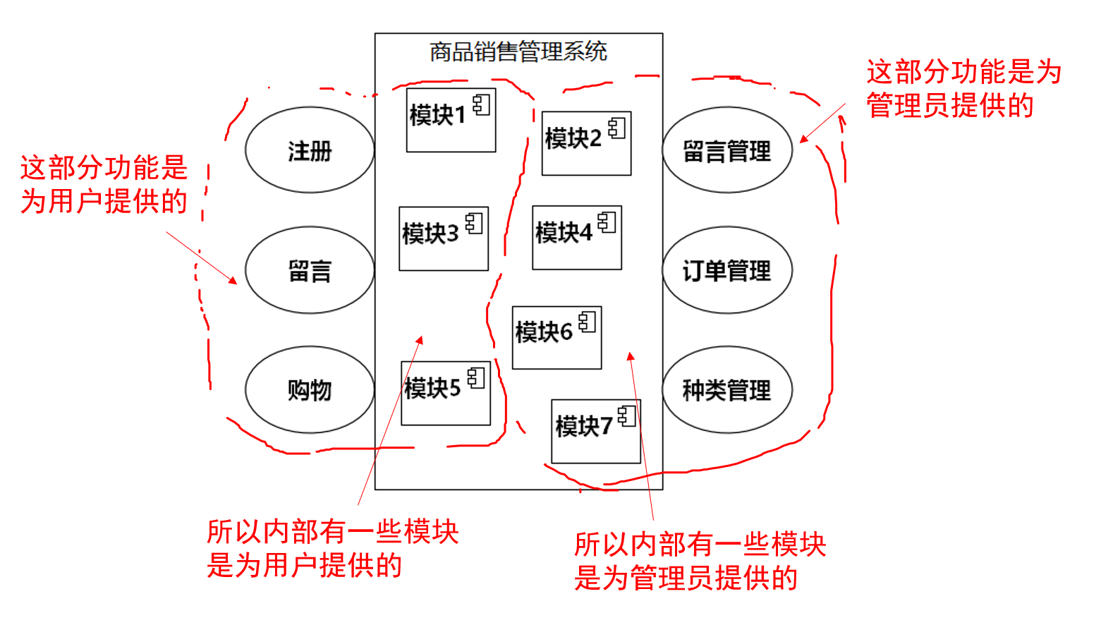 从图5得知,“商品销售管理系统”有很多功能,其中一部分是给用户使用的,另一部分是给管理员使用的,所以很多人会说“本系统分为两大功能模块——用户模块和管理员模块”,但是这样的说法在意识里不知不觉犯了从外直接映射内部的错误,如图6。