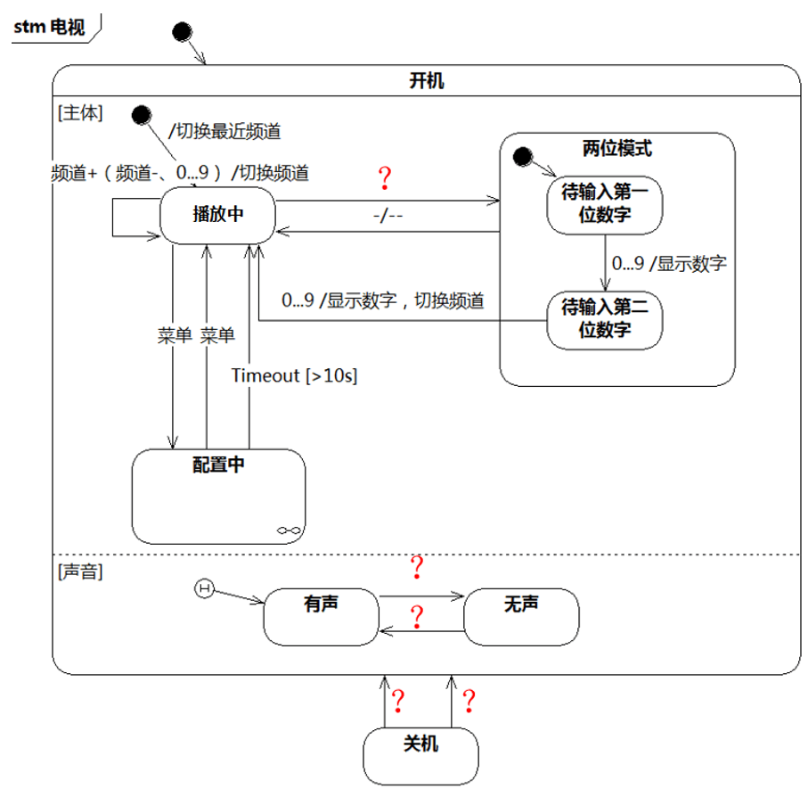 图23 用状态机图表达电视的需求(读者可以自行思考图中?处应该写什么。看起来一目了然,其实写对不容易。)