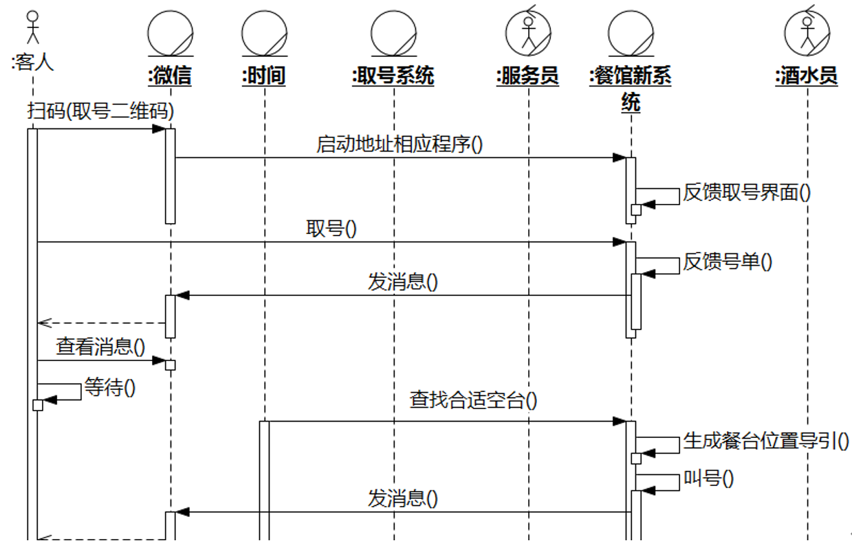 有时候“业务”指的是范围上的划分,含义是“组织级别”。例如,“业务建模”说的是组织级别的建模、“业务用例”说的是组织为其他组织提供的服务,“业务流程”说的是组织内各个系统之间协作的流程。如图9,表达了餐馆的“业务流程”。