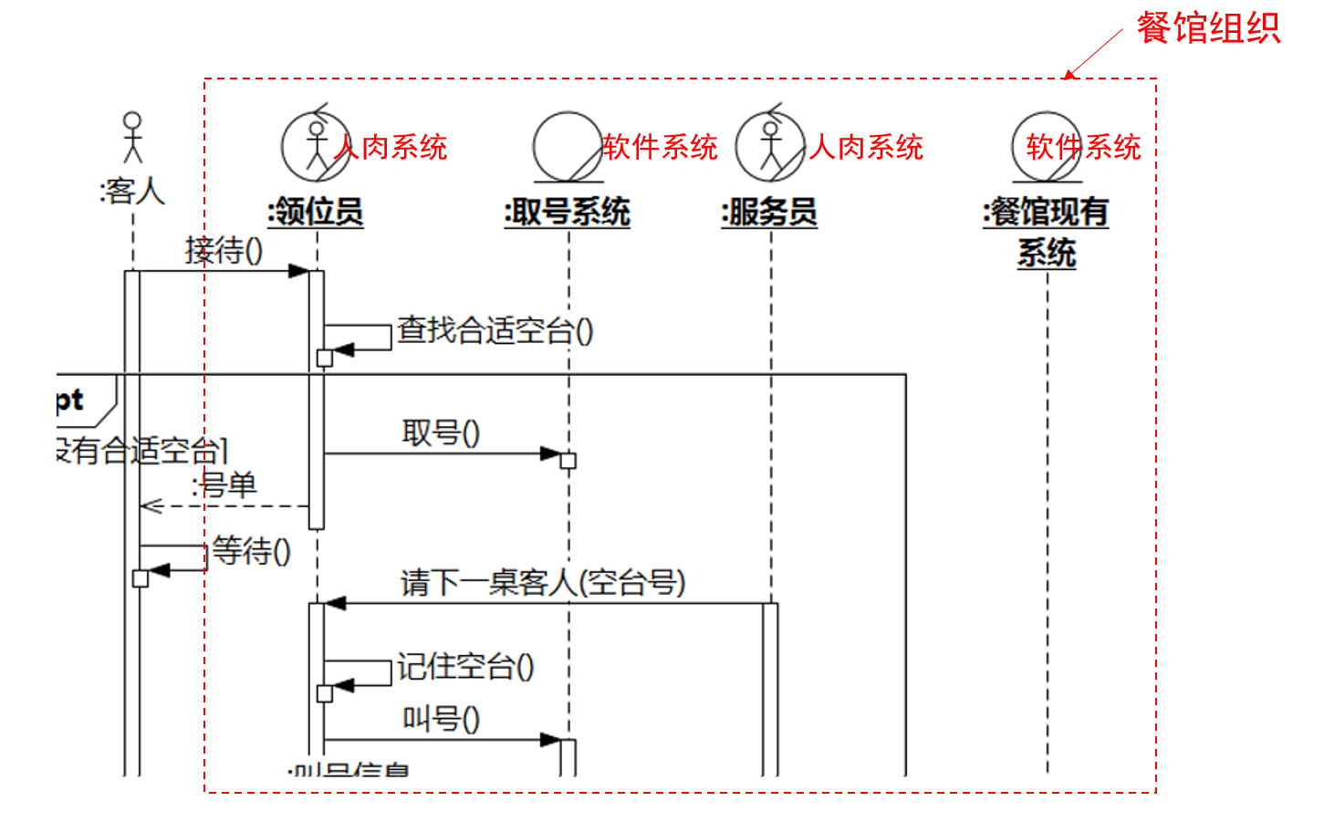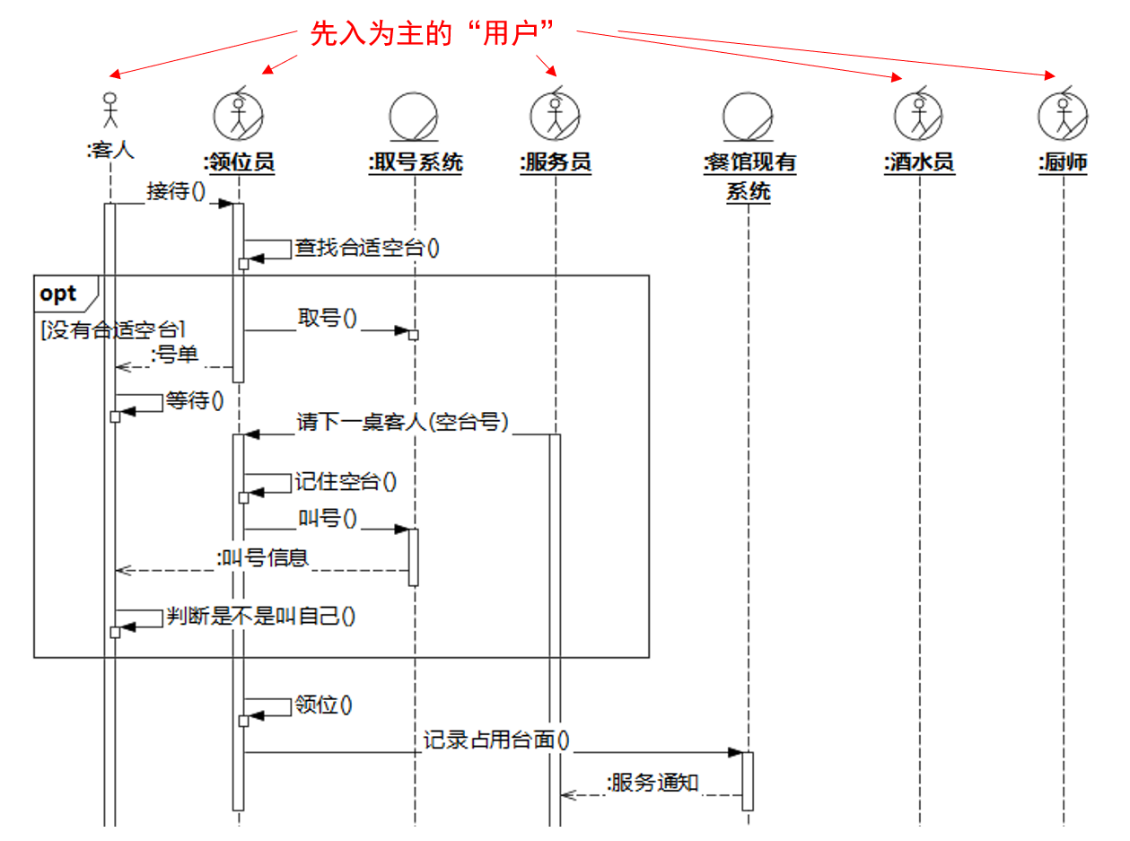我们来看图9的餐馆的例子。我们把它搬到图16。假设图16是餐馆的现状,餐馆的老板希望在此现状之上进一步改进。需求人员很容易先入为主,认定上面的人就是新系统的“用户”,然后逐个找这些“用户”调研。