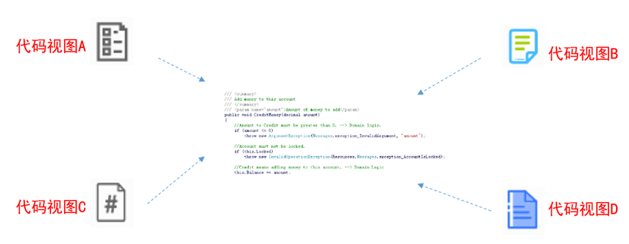 (2)软件开发人员一旦把工件简单分割为“代码”和“文档”,还会导致这样的误解:认为“文档”只不过是“代码”的一种比较概要或比较形象的表现形式,不同的“文档”代表着“代码”的不同视图,可以让开发人员从不同的视角观察代码,这样就便于人脑把握代码的复杂性。如图20所示。