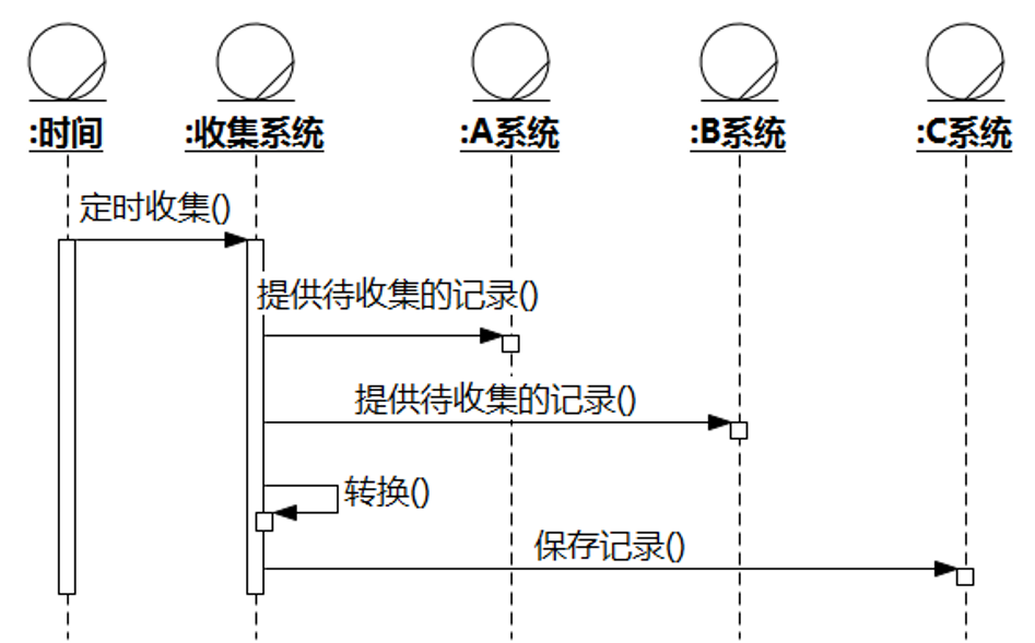 有时“用户”也会用在根本没有人机交互的地方,如图15。一个定时收集信息的系统,根本不需要和人交互,但需求人员也会说“用户是怎么要求的?多长时间收集一次?速度要多快?源格式和目标格式是怎样的?”此时,“用户”不是指和所研究系统交互的人,而是系统所服务的目标组织的某个负责和开发团队接口的人。例如,假设这个系统为某市国税局服务的,需求人员刚才说的“用户”可能是国税局信息中心的副主任。怎样称呼这位副主任才正确,后文再说。