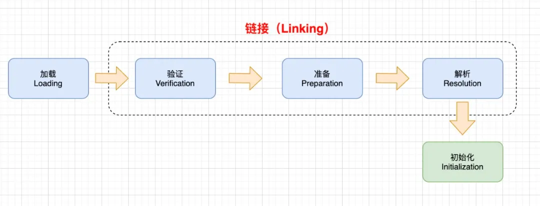 类的生命周期通常包括:加载、链接、初始化、使用和卸载。上图中包含了类加载的三个阶段:加载阶段、链接阶段和初始化阶段。如果将这三个阶段再拆分细化包括:加载、验证、准备、解析和初始化。