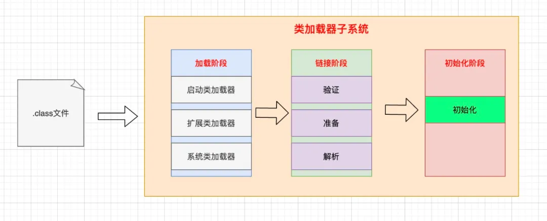 - 初始化:类加载最后阶段,若该类具有超类,则对其进行初始化,执行静态初始化器和静态初始化成员变量。