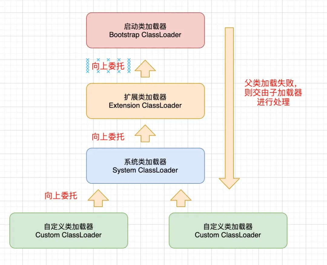 假设我们有一个将应用程序类加载到JVM中的请求。系统类加载器首先将该类的加载委托给其父扩展类加载器,而父扩展类加载器又将其委托给引导类加载器。