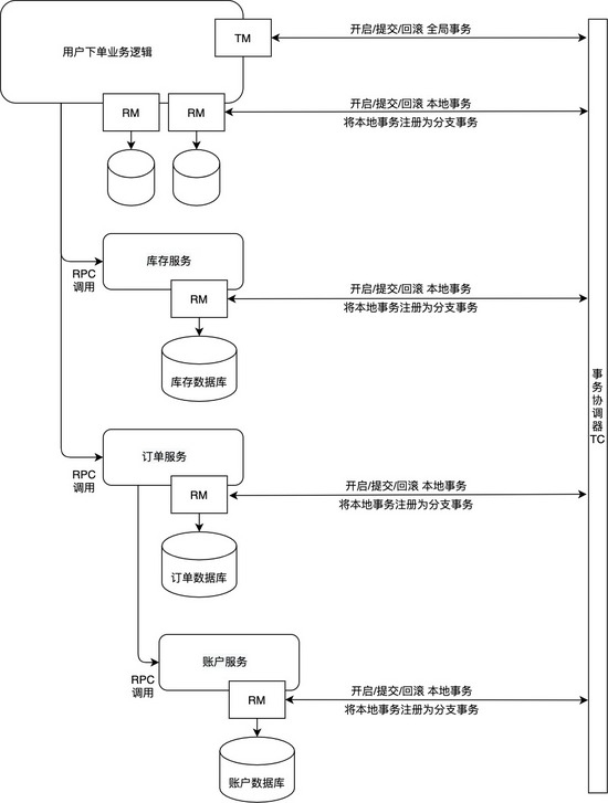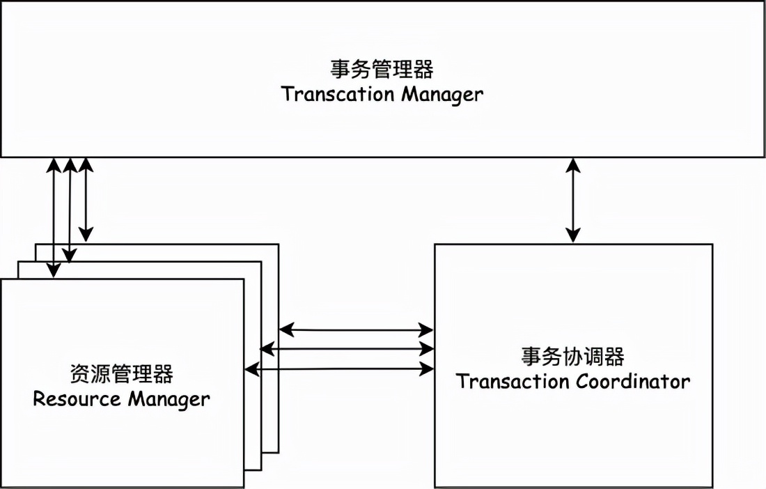 - 资源管理器(Resource Manager,RM):管理分支事务中的资源,向事务管理器注册分支事务和并报告分支事务的状态,负责分支事务提交或回滚;
