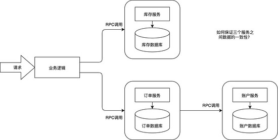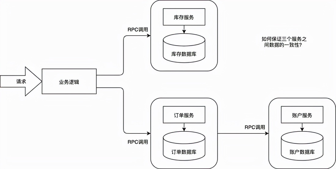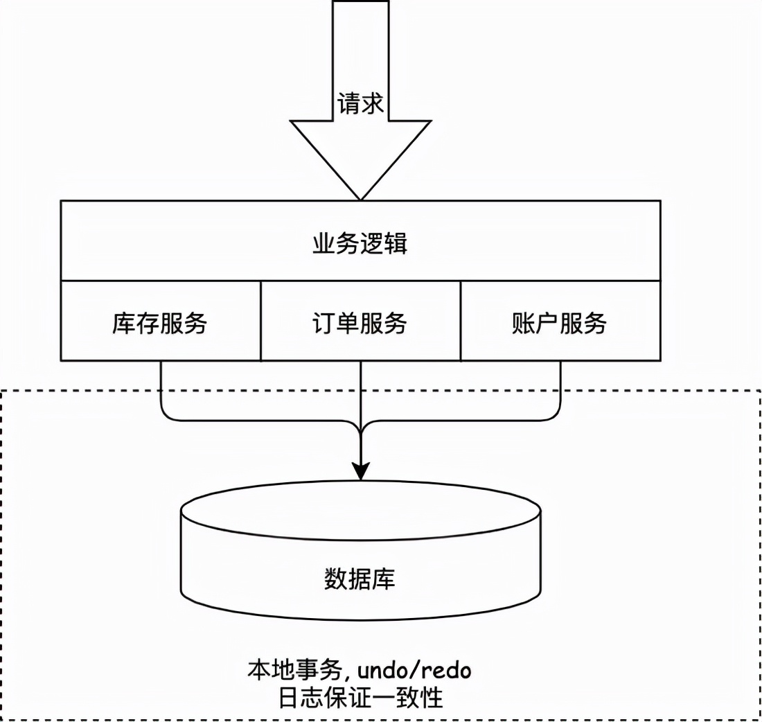如果用户下单购买商品涉及到的服务都在一个传统的单机服务中,三部分服务可以共享同一个数据库实例。这种情况下,我们可以通过本地事务的一致性保证仓储/订单/账户三者之间数据的一致性。